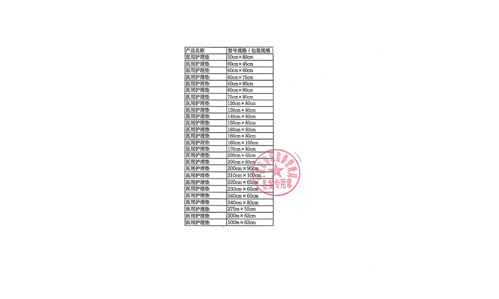 [規(guī)格尺寸] 醫(yī)用護(hù)理墊的基本規(guī)格尺寸為50cm×80cm、60cm×45cm、60cm×60cm、60cm×75cm、60cm×80cm、60cm×90cm、75cm×80cm、120cm×80cm、130cm×80cm、140cm×80cm、150cm×80cm、160cm×60cm、160cm×80cm、160cm×100cm、170cm×80cm、200cm×65cm、200cm×80cm、200cm×90cm、210cm×100cm、220cm×65cm、230cm×60cm、240cm×60cm、240cm×80cm,275m×55cm、200m×62cm、100m×63cm規(guī)格允差為±8%。